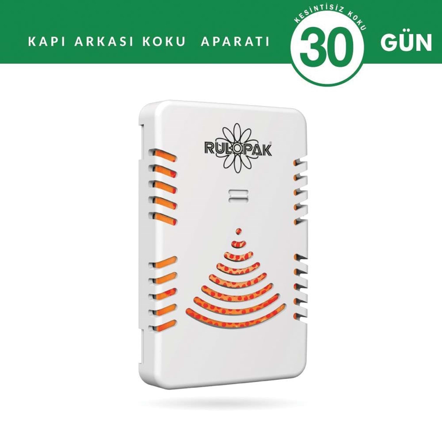 Rulopak Kapı Arkası Koku Aparatı Beyaz Rulopak kapı arkası koku aparatı bulunduğu ortama hoş, ferah ve kalıcı bir koku salar. Kapı arkası koku aparatı, kapıların açılıp kapanırken ve odadaki hava sirkülasyonu ile ortama koku yayar. Elektrik ve pil enerjisine ihtiyaç duymaz. İhtiyacınız olan farklı alanlarda da kullanabileceğiz pratik ve ergonomik bir yapısı vardır. Kurulum için vida ve delme işlemlerine gerek yoktur. İçerisinden çıkan çift taraflı bant sayesinde kuru, temiz yüzeylere yapıştırabilirsiniz. Kullanımı gayet kolaydır. İçerisinden çıkan anahtar sayesinde kolayca açıp kapatabilirsiniz. Temizliği de gayet kolaydır. Nemli bir bez yardımı ile temizleyebilirsiniz. Bezin ıslak olmamasına dikkat ediniz. Rulopak Kapı Arkası Koku Aparatı Nerelerde Kullanılır? Rulopak kapı arkası koku aparatı, öncelikle kapı arkalarında, asansörlerde, ofislerde, tuvalet, banyo, mutfak, soyunma odası, spor salonu, kapalı kasa ticari araçlar, girişler, dolap kapakları gibi alanlarda ve yüzeylerde kullanabilirsiniz. Genel özellikleri; İçerisine takılacak sihirli koku yaprağı ile 30 gün boyunca kesintisiz koku yayar (Sihirli koku yaprağı haricen satılır) Kullanımı kolay ve basittir Ortama ferah ve temiz bir koku yayar. Pil ve elektrik enerjisine ihtiyaç duymaz. Birçok farklı alanda kullanılabilir. Basit bir kurulumu vardır. 10 metrekare alanda etkilidir. 7,5 x 1,5 x 12 cm ebatlarındadır.