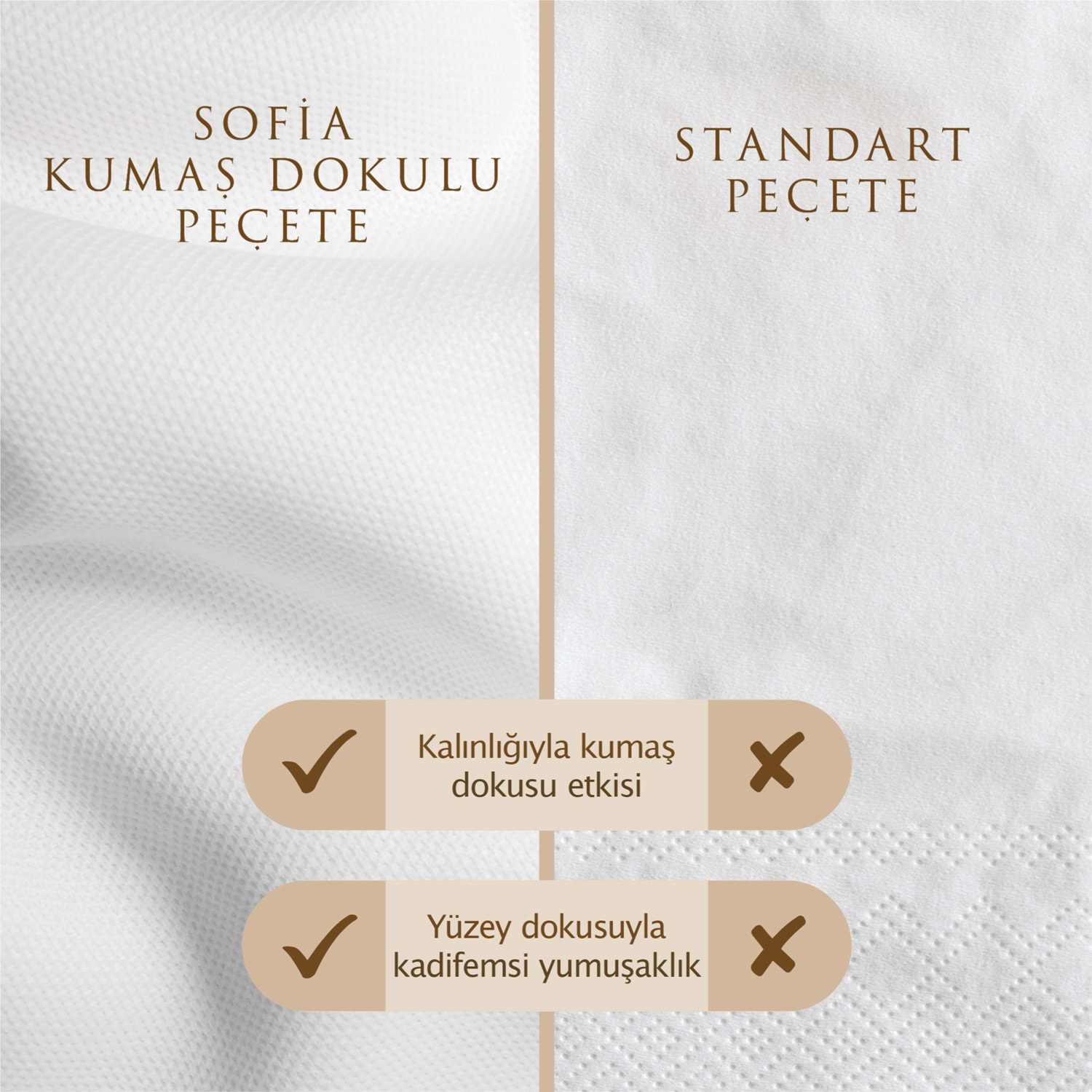 Sofia Kumaş Dokulu Peçete 30'lu Beyaz günlük sofralara özel Sofia dokunuşu… Sofia Kumaş Dokulu Peçete, 2 katlı yapısından gelen emiciliği, yüzeyindeki minik noktaların sağladığı kumaş doku etkisi ve kadifemsi yumuşaklığı, şık duruşu ile sofra sunumlarınızı tamamlıyor. Ürün desenli değildir.